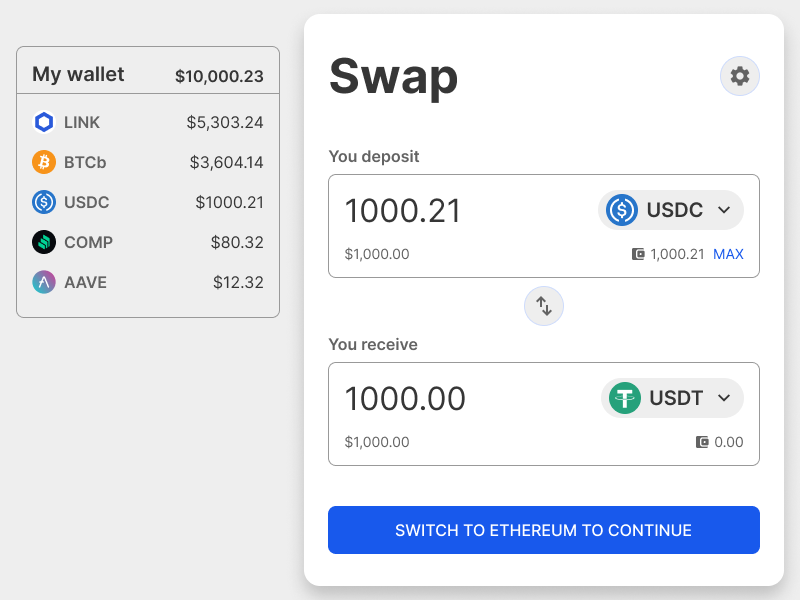 Example: A subtle container shows the user what relevant tokens they have in their wallet, and the main CTA provides a shortcut to change the network.